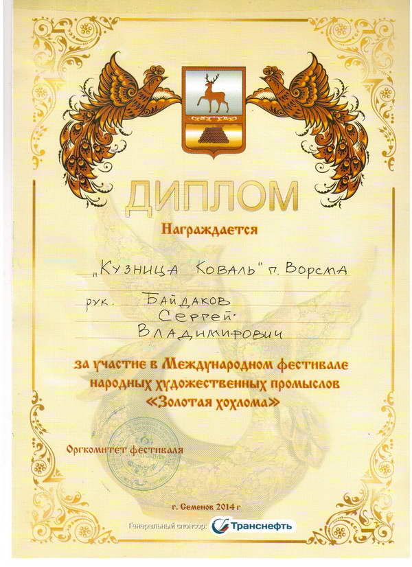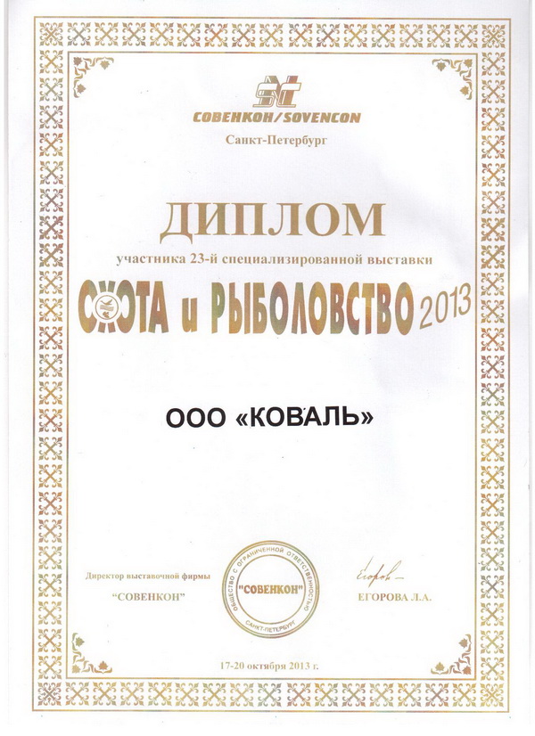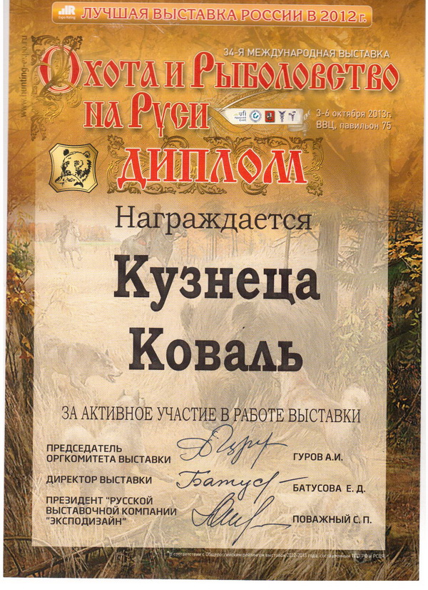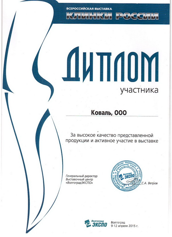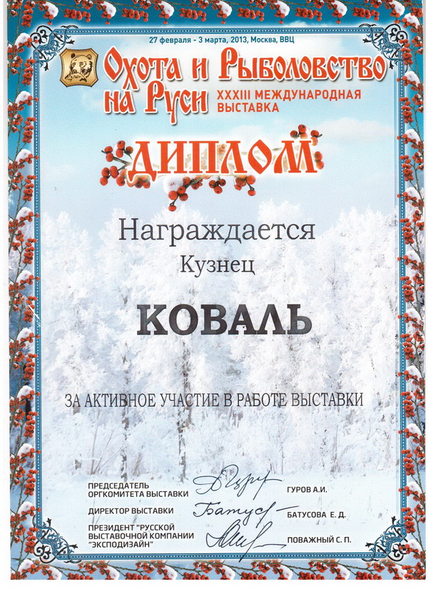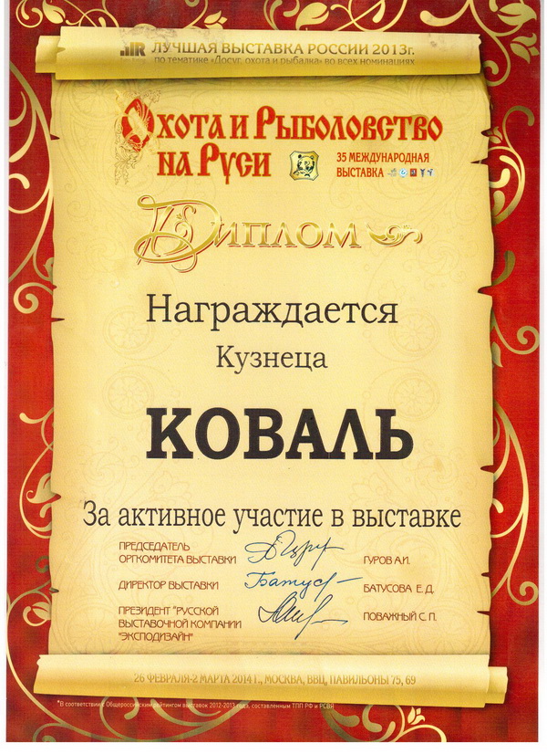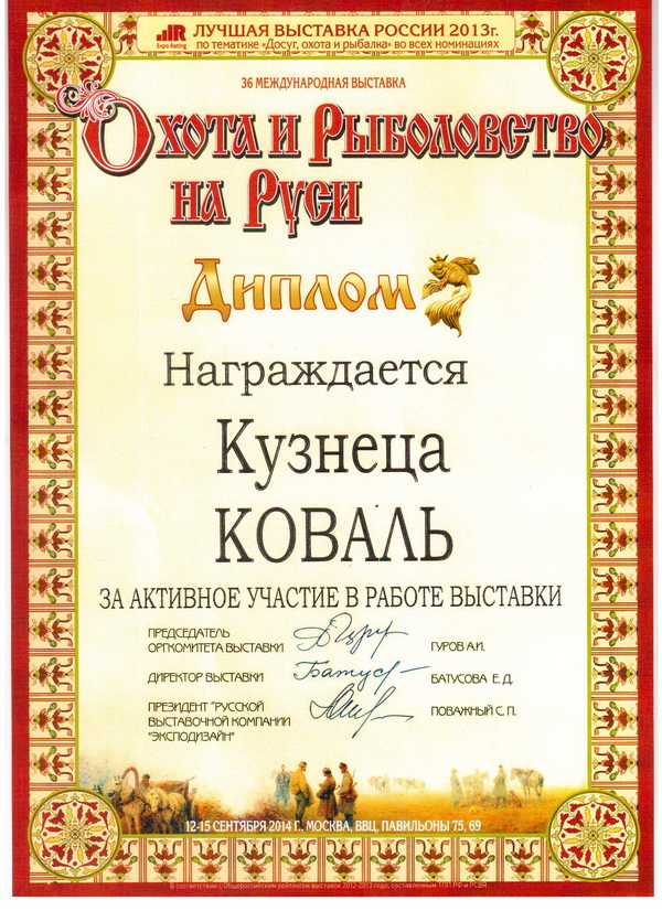 Все изделия нашей компании сертифицированы. Каждый нож имеет паспорт, содержащий техническое и художественное описание и информацию об авторе. Вся ножевая продукция кузницы “Коваль” не требует специальных лицензий и разрешений.