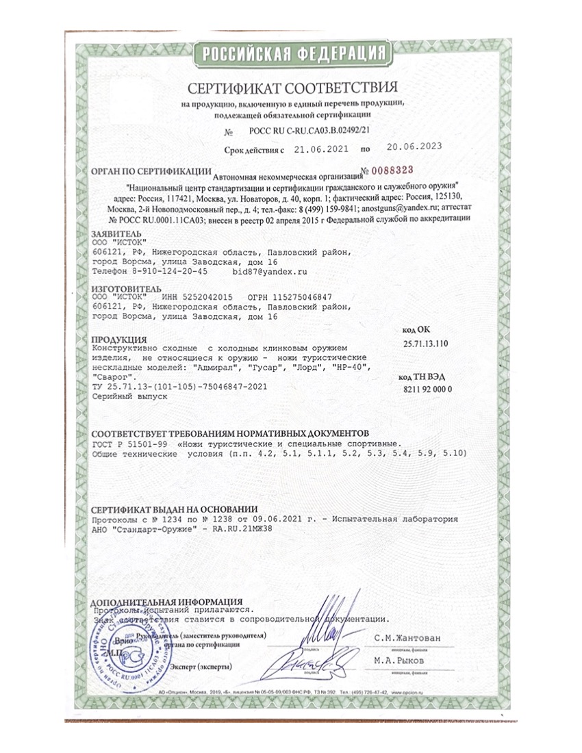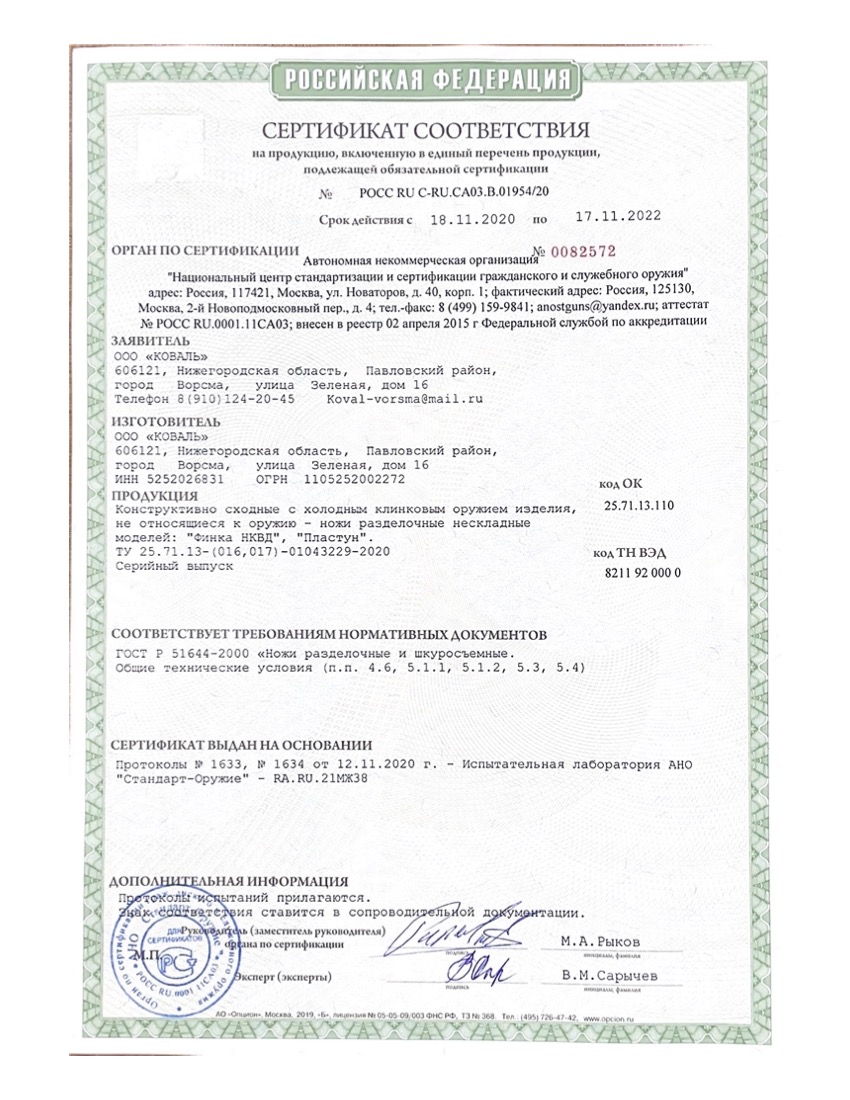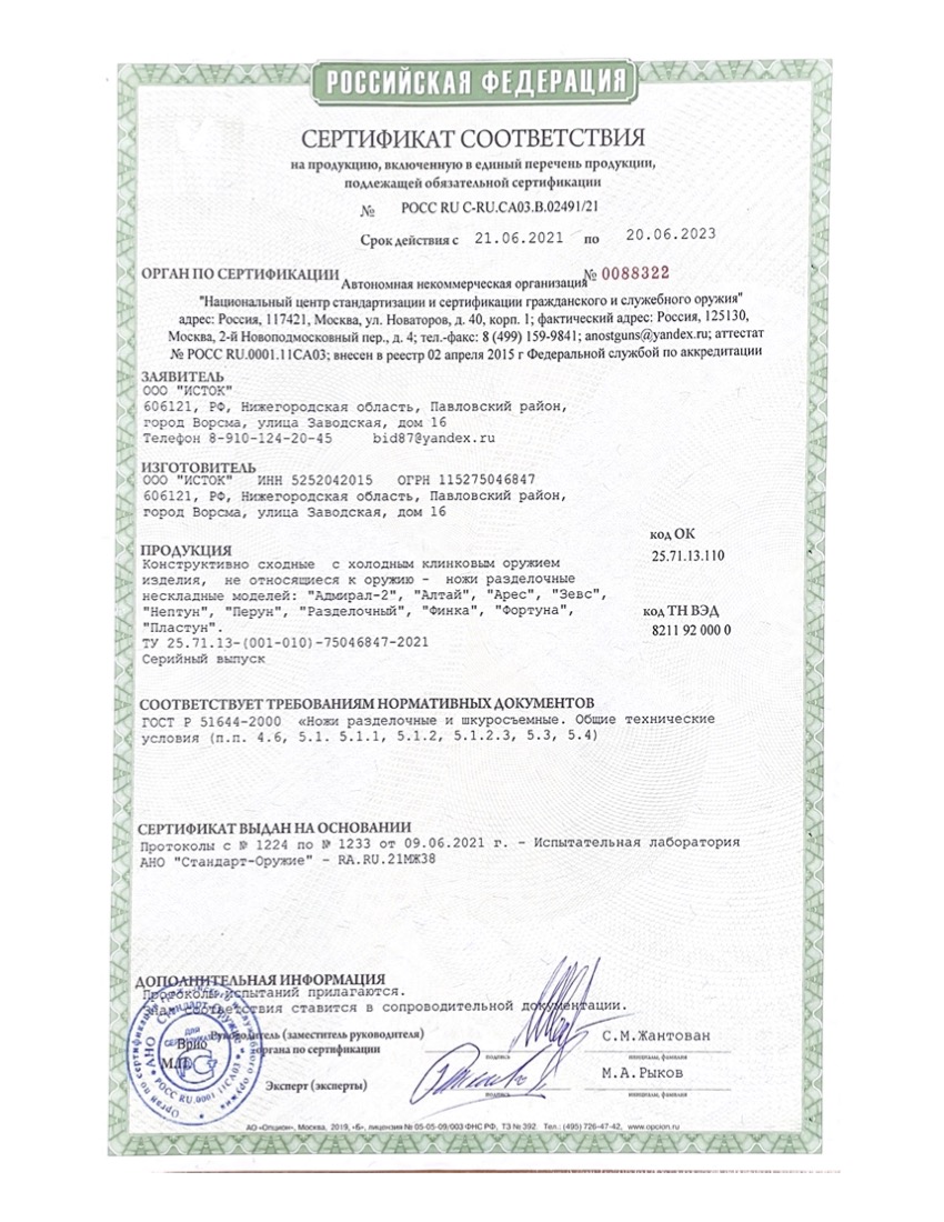 Все ножи, представленные на нашем сайте – это хозяйственные и разделочные ножи. Каждый нож имеет сертификат по ГОСТ Р 51644-2000 «Ножи разделочные и шкуросъемные» или ГОСТ Р 51501-99 «Ножи туристические и специальные спортивные».